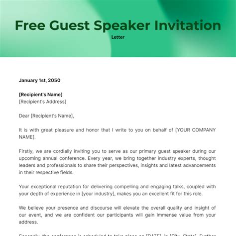 Invitation Letter For Guest Speaker Example . Use this letter when you are contacting a potential speaker to invite him or her to speak at an event. Dear [guest speaker], we are pleased to invite you to be a guest speaker at.